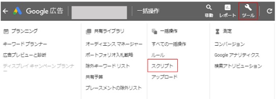 Google広告のスクリプトは、上部の「ツール」→「スクリプト」の順に選択して設定画面へ移動します。