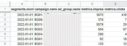const query2 = “SELECT segments.month, campaign.name, ad_group.name, segments.device, metrics.impressions, metrics.clicks, metrics.cost_micros, metrics.conversions ” +“FROM ad_group WHERE segments.month BETWEEN ‘2022-01-01’ AND ‘2022-12-01’ ORDER BY segments.month”;