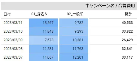 これだけでは「日別×広告グループ」で細分化されたデータで見づらいので、集計する必要があります。