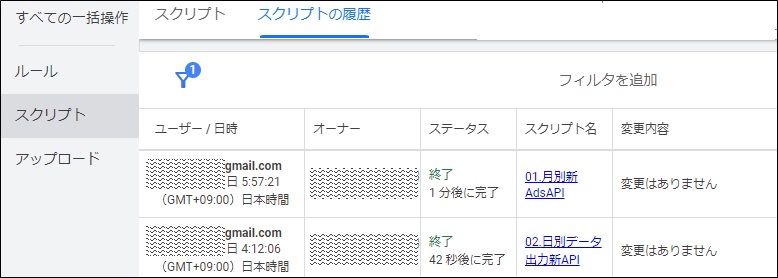 ちゃんと時間内に新たなデータが出力されたのかスプレッドシート上の変更履歴でも確認できますし、スクリプト一覧の「スクリプト履歴」から実行日時ごとに、成功かエラーが出たか確認することもできます。