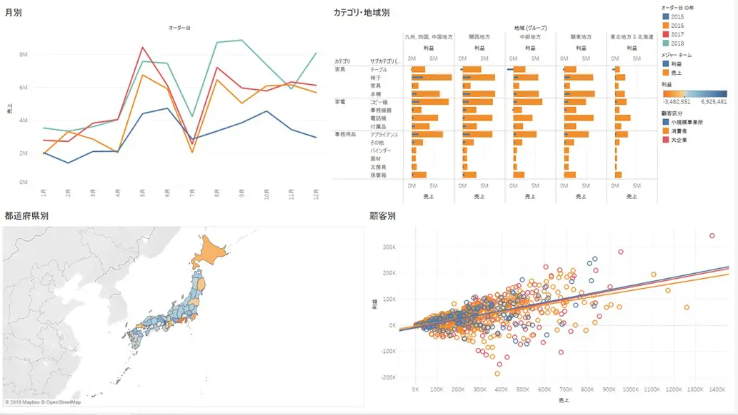 Tableau Prep Builderで処理されたデータは、簡単な操作でTableau Desktopに直接出力でき、迅速に詳細なビジュアライゼーションや分析が行えます。Tableau Desktop内で「新しいデータソース」から「その他」でデスクトップ内でPrepで出力したファイルを選択して読み込むことで、成形したデータが反映されます。