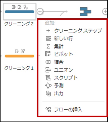 データソースを繋げたら、次に「クリーニングステップ」と呼ばれているドラッグアンドドロップでデータソースを追加したり、ピポットを作成したり、データソースを結合するステップに移ります。不要なデータの削除、型の変換、欠損データの処理など、データを望む形に整えるための機能が充実しています。