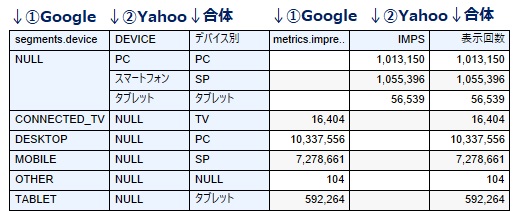 例えば、「デバイス別の表示回数」でGoogleとYahooを合体したイメージは下記のとおりです。