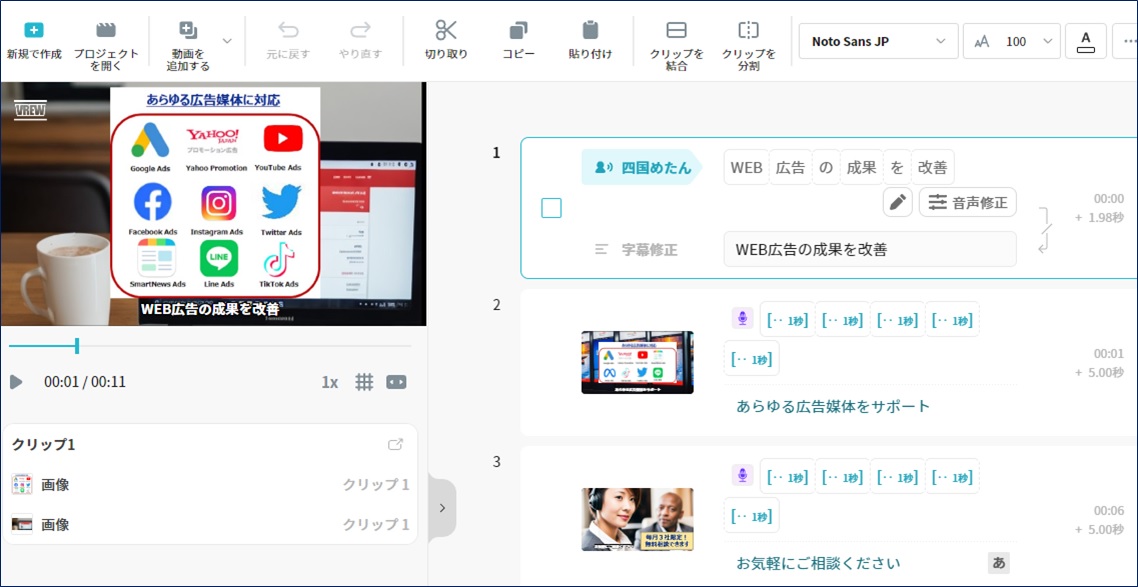 このように、Vrewは非常に便利な機能が備わった動画編集ツールで、初心者でも作成しやすいツールです。AIによる自動動画生成、音声生成はとても助かる機能ですし、自由に継ぎ接ぎできるため静止画や音声を自社素材に合った形式で整えて訴求しやすい完成版にして広告配信などに使えます。