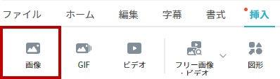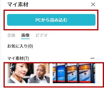 今度は自社で手持ちの静止画やロゴなどをアップロードする場合についてです。上部にあるツールバーの中から「挿入」→「画像」とクリックして、右側の「マイ素材」の「PCから読み込む」を押せば静止画を追加できます。