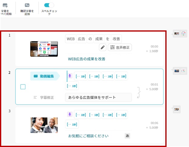 ・字幕を一括で全音声に対して入力できる。補正も可