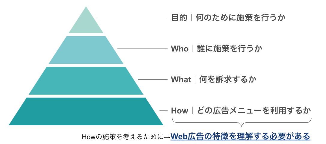 Web広告はWeb広告は目的→Who→What→Howの順に考えます。