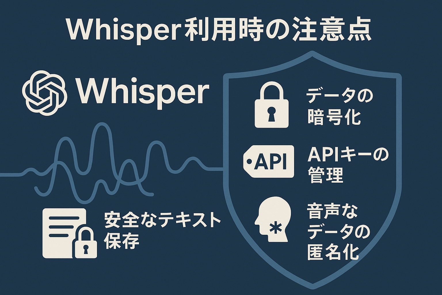 Whisperを利用する際には、機密情報や個人情報の取り扱いに十分な注意が必要です。特にAPIを利用する場合は、データの暗号化やアクセス制限などのセキュリティ対策を行い不正アクセスが起きないようにする必要があります。