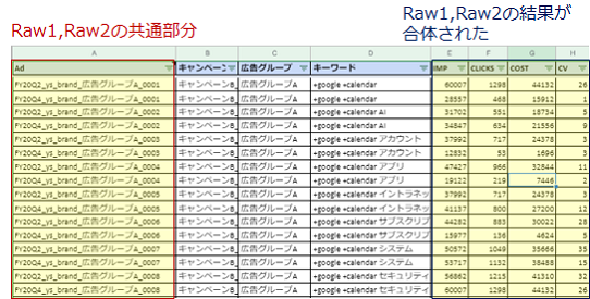 次に、2つのrawデータを合体させて、クリック、費用、CVがキーワード別に見れるようにします。