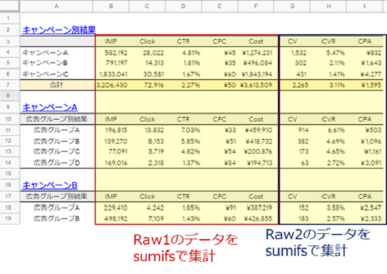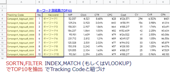 つまり、Raw1とRaw2をCV降順に並べた際に、Raw1にCVデータがなくうまく紐づかないので、一旦Tracking Codeで表示回数、クリック、費用、CVを一列に並べる連携データを作成しています。