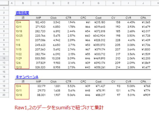 期間は日曜〜土曜の7日間を日曜日の日付(A列「日付」欄)で統一して、各指標合計値を集計します。